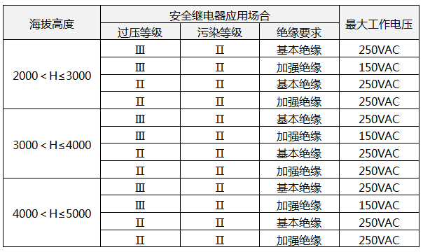 現針對可能有客戶將安全繼電器應用到不同海拔高度的環境,安全繼電器說明書上所提供的技術參數適用于海拔高度最高2000m的操作高度應用,若需要將安全繼電器應用在海拔高度大于2000m且小于等于5000m的環境下,則建議應降額使用。