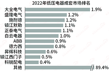 2022年低壓電器成套設(shè)備整體市場業(yè)績?yōu)?421.0億元,其中TOP5的盤廠企業(yè)依次為大全電氣、盛隆電氣、施耐德、鎮(zhèn)江默勒、正泰電氣。TOP5企業(yè)業(yè)績占比總計(jì)為6.5%。