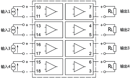 2、三入三出和四入四出輸入側獲取能量無源信號隔離器接線圖