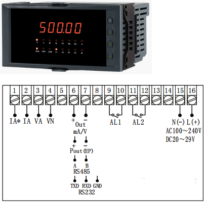 ⑦變送輸出(160×80mm儀表通訊和變送輸出不能同時存在;96×96mm、96×48mm和80×80mm儀表通訊和變送輸出可以復(fù)選)