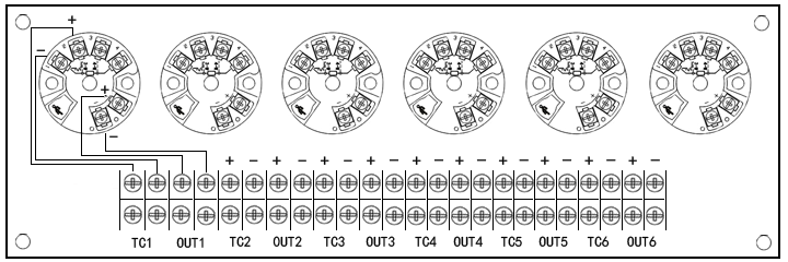 4、現場儀表箱YRINX03-39內部固定有安裝板1塊。安裝板上已加工好溫度變送器安裝螺紋(有安裝孔距33mm和36mm兩種,M4螺紋);安裝板上有24個接線端子,供用戶接熱電偶補償導線和4-20mA信號線用。