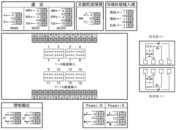2、YR-LCD-GFM系列液晶多路顯示控制儀(溫度巡檢儀)選擇16路輸入時(shí),不帶同時(shí)帶分別變送和分別報(bào)警功能。