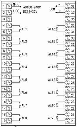 [2]:繼電器分別報(bào)警輸出[注1-3]/八路巡檢儀每1路輸入對(duì)應(yīng)2限報(bào)警,16路巡檢儀每路輸入對(duì)應(yīng)1個(gè)報(bào)警
