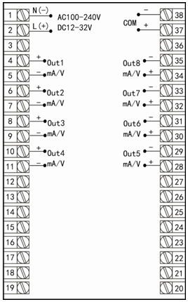 b、八路測(cè)量+八路分別變送輸出+統(tǒng)一報(bào)警輸出