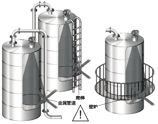 ◆外罐壁為GRP之類的非導電材料塑料罐用雷達液位計測量液位時,雷達液位計微波信號同樣會被信號波束角外的干擾物(比如金屬管道、爬梯、壁爐)反射回來。因此在雷達液位計信號波束角內不能安裝此類干擾物。