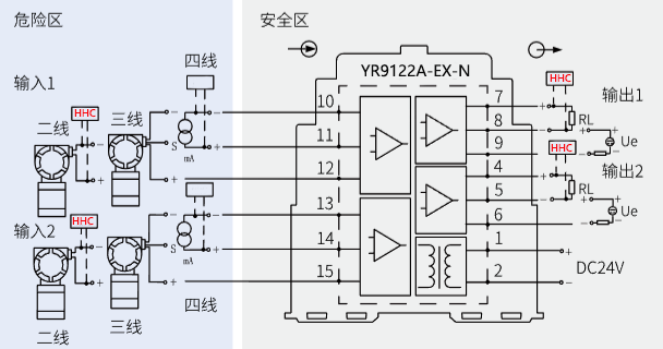 ③二進(jìn)二出YR9122A-EX檢測端隔離式安全柵接線圖
