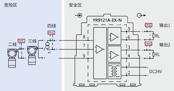 ②一進(jìn)二出YR9121A-EX檢測端隔離式安全柵接線圖