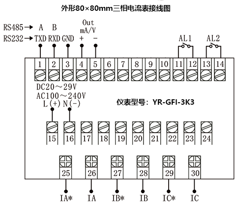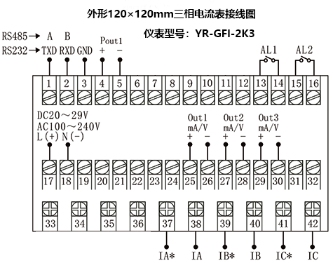 [3M]:120×120mm外形為3路0-20mA變送輸出(RL≤500Ω);其他外形為1路0-20mA變送輸出