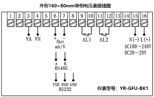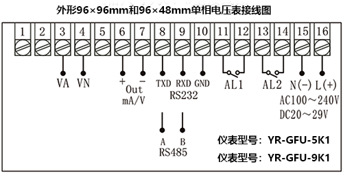 ①YR-GFU-5K1外形尺寸:96×48×85mm(高×寬×深) ;開孔尺寸:92×45mm(高×寬)
