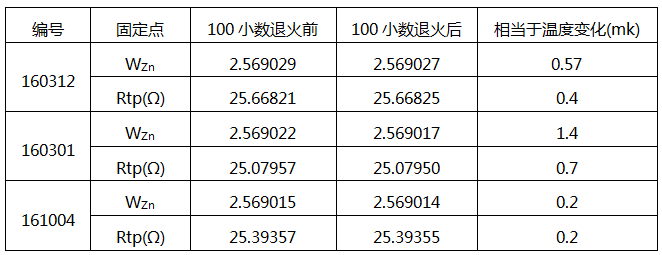 長期穩定性參照規程的規定方法,鋁點標準鉑電阻溫度計測定了WZn和Rtp后,在上限溫度退火100小時再次測量WZn和Rtp,測量結果列于表1。