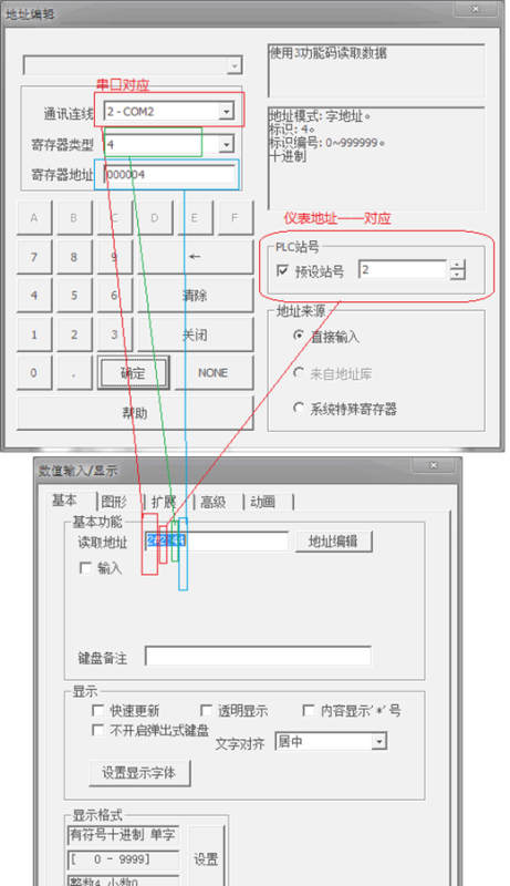 根據上面設置的串口,選擇COM2,寄存器類型選擇4,使用的是MODBUS中的03讀取指令。寄存器地址選擇4(000004是顯示格式,值就是4),和下表的儀表讀取一致。