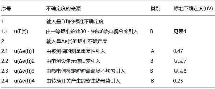 6.1 二等標準鉑銠30-鉑銠6熱電偶的不確定度分量匯總表見表9。
