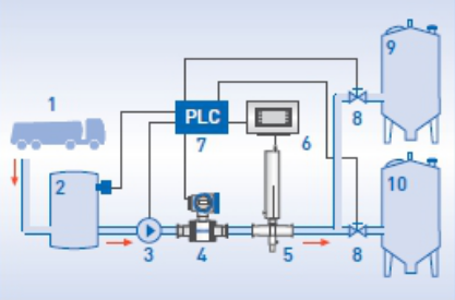 說明:1為生鮮奶運料車;2為緩沖罐;3為泵;4為流量計;5為OPTIQUAD-M 4050W在線分析單元;6為OPTIQUAD-M 4050W操作單元;7為PLC(可編輯邏輯控制器);8為閥門;9為高蛋白含量儲罐;10為低蛋白含量儲罐