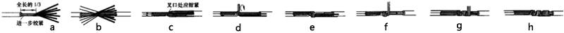 如圖4a所示首先把兩個(gè)多股導(dǎo)線散開拉直,并將占全長(zhǎng)三分之一的導(dǎo)線絞緊,然后把剩下三分之二部分導(dǎo)線分散成傘狀,把兩股導(dǎo)線的傘狀芯線頭隔根對(duì)插(如圖4b),并將其中一端的芯線分成三組。將第一組的芯線扳起并垂直于芯線,按順時(shí)針方向緊繞2圈(見圖4c、d),把第二組的芯線仍按順時(shí)針方向緊緊壓住前面的芯線,纏繞2圈(見圖4f),把最后一組的芯線按上述方法順時(shí)針方向緊緊壓住前芯線纏繞4圈(見圖4g).最后切去每組多余長(zhǎng)度的芯線,平整端部,去除毛刺。用上述方法纏繞另一邊芯線(見圖4h)。