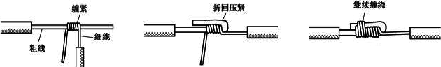 連接方法如圖2所示,先在兩導(dǎo)線的芯線重疊處填入一根相同直徑的芯線,再用一根截面約1.5mm2的裸銅線在其上緊密纏繞,纏繞長(zhǎng)度為導(dǎo)線直徑的10倍左右,然后將被連接導(dǎo)線的芯線線頭分別折回,再將兩端的纏繞裸銅線繼續(xù)纏繞5-6圈后剪去多余線頭即可。