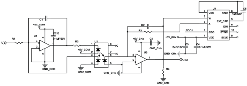在U1和U3運放的選型上,需要選擇噪聲密度小的,并且選擇噪聲對開關增益影響小的運放。同時,為了保證精度,對放大器的+5V供電電源需要控制紋波的幅度,為了降低對紋波的影響,需要對運放的電壓抑制比進行選擇。由于運放的電源電壓的變化會影響輸入差分電壓的偏置點,運放內(nèi)部結(jié)構(gòu)的匹配性誤差,輸入差分電壓的偏置點的改變會引起輸入失調(diào)電壓的改變,同時導致輸出電壓的變化,影響電路的精度。在EDA設計的時候也需要對運放的電源以及旁路電容的布置予以考慮,避免由PCB上引入更多的干擾影響模擬量信號隔離器轉(zhuǎn)換的精度。