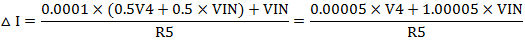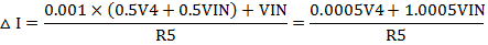 根據(jù)公式(8)可以知道,當R1=R2=R3=R4時,輸出電流值I只與R5相關;當R5等于采樣電阻時,輸出電流等于輸入電流。且負載的變化對電流輸出沒有影響。當R1≠R2≠R3≠R4時,電流I與輸出電壓VIN呈非線性關系。并且當負載變化時,導致V4發(fā)生變化,根據(jù)公式(6)可知,V1會根據(jù)V4的變化而變化。