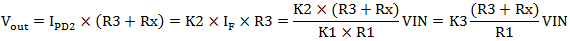 副邊的光敏二極管在發(fā)光二極管的照射下產(chǎn)生一個微小的電流IPD2,電流通過放大器的反饋電阻輸出電壓Vout。為了保證輸入U和輸出Uout相等,通過數(shù)字電位計對放大器U3的反饋電阻進行調(diào)整,數(shù)字電位計的阻值為Rx。定義 K1=IPD1/IF,K2=IPD2/IF。
