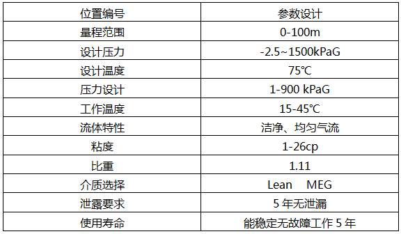 在海上平臺投入式液位變送器的設計過程中,最為重要的一項設計因素就是對其設計中的參數設計做出專門的分析,這是保障海上平臺投入式液位變送器應用的重要性前提。本文在研究中,以樁腿MEG液位變送器為例對其應用中的參數做出了專門的設計。具體的參數設計如表1所示: