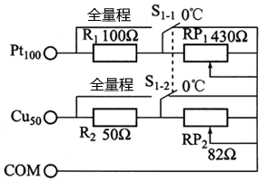S1是一個KN型的雙極雙位鈕子開關(guān).當S1開關(guān)在“0℃”位置時,它把兩只電位器都短接了,這時從Pt100端與COM端輸出的電阻值為100Ω,對應溫度為0℃。從Cu50端與COM端輸出的電阻值為50Ω,對應溫度為0℃??捎脕頇z查熱電阻輸入的數(shù)顯表的0℃點顯示是否正常。