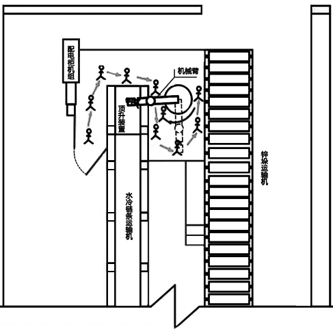 某冶煉廠熔鑄工序307班鋅錠碼垛作業(yè)線機(jī)械臂主操手A在自動(dòng)碼錠機(jī)組未停機(jī)情況下,從未關(guān)閉的隔離欄安全門進(jìn)入 自動(dòng)碼錠機(jī)作業(yè)區(qū)域,在機(jī)械臂作業(yè)半徑內(nèi) 進(jìn)行場(chǎng)地衛(wèi)生清掃,行走至碼錠機(jī)取錠位置與機(jī)械臂區(qū)間時(shí),因頂錠裝置接收到水冷鏈條傳輸過(guò)來(lái)的鋅錠,信號(hào)傳輸至機(jī)械臂,機(jī)械臂自動(dòng)旋轉(zhuǎn)取錠,瞬間將金某推倒在頂錠裝置上,鋅錠抓取夾具擠壓在金某左部胸腔。