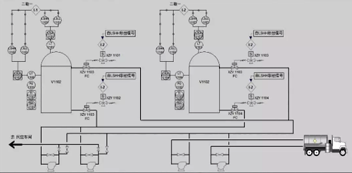 由于文章篇幅篇幅限制,只詳細介紹節點N01:苯乙烯儲運。為了方便理解其流程,做了動態簡化流程圖(去除BPCS和SIS相關儀表,只留管線圖)如下所示,槽車卸料至儲罐,儲罐物料輸送至反應車間,雙泵、雙罐、雙管線。