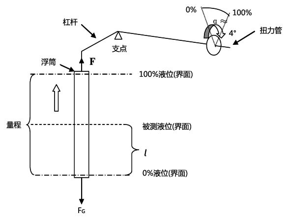 在量程0%處浮力:F0=FG,在量程100%處浮力:F100=FG-V×ρ×g;α為扭力管的轉(zhuǎn)角=液位在量程100%處的角度-液位在量程0%處的角度;FG為浮筒的重量;V為浮筒體積;L為全量程;l為液位的高度;ρ為液體比重;g為重力加速度;F為浮力=FG-V×ρ×g。