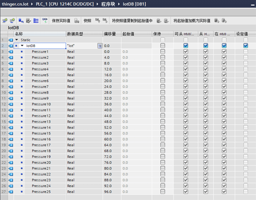 首先在PLC中準備好需要傳輸的數據,最好提前都數據到放到同一個存儲區中,并且是連續的N個字節,這里以一個結構體為例,里面包含25個浮點數,占100個字節,如下圖所示: