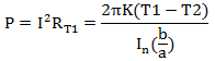 第一步,電纜中單位長度的熱量在導體中產生并通過絕緣層向外按徑向傳導的功率由等式2給出。根據下面等式2,繪制出P與T2的關系曲線,這個是電線導體產生的熱量功率。