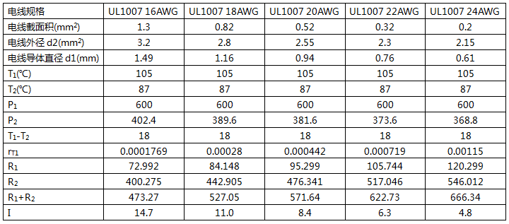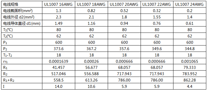 我們先以溫升18度時的電流進行計算。由于JASO D609的計算公試是以最高工作溫度減去環境溫度的方法來表示溫升的。所以,我們設定UL1007電線的最高工作溫度是80度,環境溫度為62度,此時,最大溫升為18度時的電流承載能力如下表。