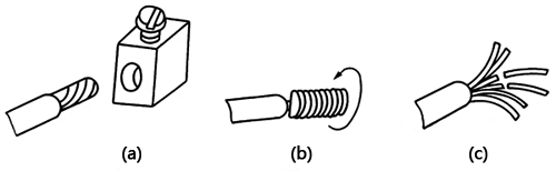 說明:圖3(a)離絕緣層根部約3mm處向外側折角;圖3(b)按略大于螺釘直徑彎曲圓弧;圖3(c)剪去芯線余端;圖3(d)修正圓圈成圓