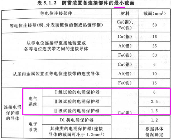 5.1.2 防雷等電位連接各連接部件的最小截面,應符合表5.1.2的規定。連接單臺或多臺Ⅰ級分類實驗或D1類電涌保護器的單根導體的最小截面,尚應按下式計算:Smin≥Iimp/8,公式中Smin為單根導體的最小截面(mm2);Iimp為流入該導體的雷電流(kA)。