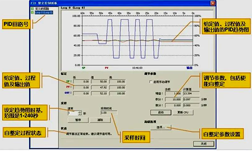 自整定。要使用PID控制面板必須與CPU通信,用PID向導配置生成一個PID回路,并將程序下載到CPU中,使CPU處于運行模式,在狀態圖表中將給定值設為60度,PID控制改為自動模式。