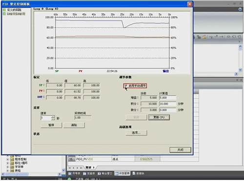 在工具菜單功能區單擊PID控制面板按鈕,打開PID整定控制面板對話框,選擇回路0,先啟動手動調節,輸入PID參數,如增益改為5.0,單擊更新CPU,使新輸入的參數值起作用,監視趨勢圖,根據調節狀況改變PID參數直至調節穩定,即過程值與設定值接近,且輸出沒有不規律的變化,并最好處于控制范圍中心附近,此時可將手動調節改為自動調節,即自整定。