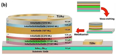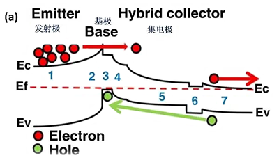 由于發射極采用了更寬帶隙的InAs/GaSb/AlSb/GaSb超晶格,在發射極和基極之間形成了高達330meV的價帶階,從而把空穴限制在基極層,同時調制了導帶的電子勢壘,使電子可以隧穿到收集極(如2圖中紅色箭頭所示),當施加外加偏壓時,也提高了電子的漂移速度,進一步抑制了電子和空穴的復合幾率,從而實現高的光增益。