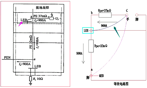 如上圖設(shè)置的LEB通過扁鋼與MEB連接,等效電路圖如右所示,僅僅是在干線PE基礎(chǔ)上增加一個(gè)并聯(lián)旁路,人和手之間電位差為900×(支線PE電阻+干線PE并聯(lián)扁鋼電阻),其值很可能還是大于安全電壓50V。