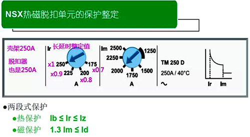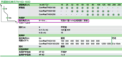 以施耐德NSX塑殼來說,250A及以下為熱磁式,長延時脫扣器整定電流(Ir)為(0.7~1)In,此處In為塑殼的脫扣器額定電流(In),不是框架電流。