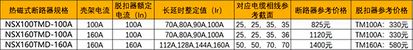 以廣大設計師最容易選擇的情況比對:施耐德規格為NSX100(殼架電流)TMD-100A(脫扣器額定電流)和NSX160(殼架電流)TMD-100A(脫扣器額定電流)和NSX160(殼架電流)TMD-160A(脫扣器額定電流)。