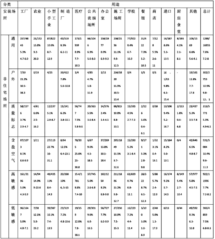 一個重要指標是平均故障率(即故障RCD與測試RCD的比率),比較各種安裝條件下的故障率,可以確定每個變量對整體故障率的影響。當RCD安裝在室內,沒有太陽輻射、液體、灰塵、振動、鹽漬和腐蝕性大氣時,被認為是“正常條件”。安裝在住宅內的RCD(總數9737)故障率為7.1%;安裝在非住宅場所的RCD故障率較高,為7.6%,主要是由于環境條件更為惡劣所致。