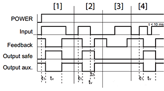 該工作模式下:如果不考慮反饋信號(hào),則當(dāng)S32輸入端從0變?yōu)?時(shí),安全常開觸點(diǎn)閉合,輔助常閉觸點(diǎn)斷開;如果考慮反饋信號(hào),則當(dāng)S32輸入端從0變?yōu)?,并且反饋信號(hào)從1變?yōu)?時(shí),安全常開觸點(diǎn)閉合,輔助常閉觸點(diǎn)斷開;當(dāng)S32從1變?yōu)?時(shí),開始計(jì)時(shí)。當(dāng)設(shè)置的時(shí)間到了之后,安全常開觸點(diǎn)斷開,輔助常閉觸點(diǎn)閉合,恢復(fù)成初始狀態(tài)。在計(jì)時(shí)的過程中,無論S32的信號(hào)是否變化,定時(shí)器不會(huì)被重復(fù)觸發(fā),直到之前設(shè)置的時(shí)間走完,這種稱為“不可重復(fù)觸發(fā)”;該工作模式的時(shí)序圖如圖3所示: