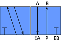 五通閥,一個進氣孔(P)和兩個出氣(A、B)和兩個排氣孔(EA、EB)。適合控制氣缸往復運動。也是最常用的電磁閥。