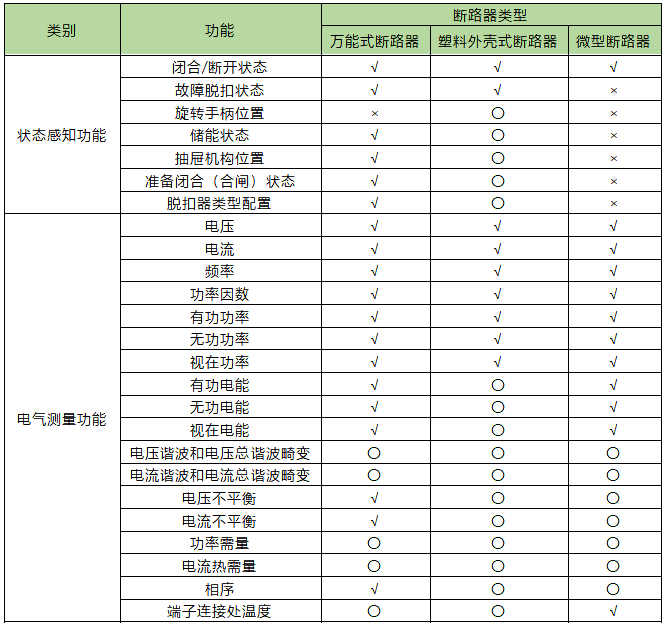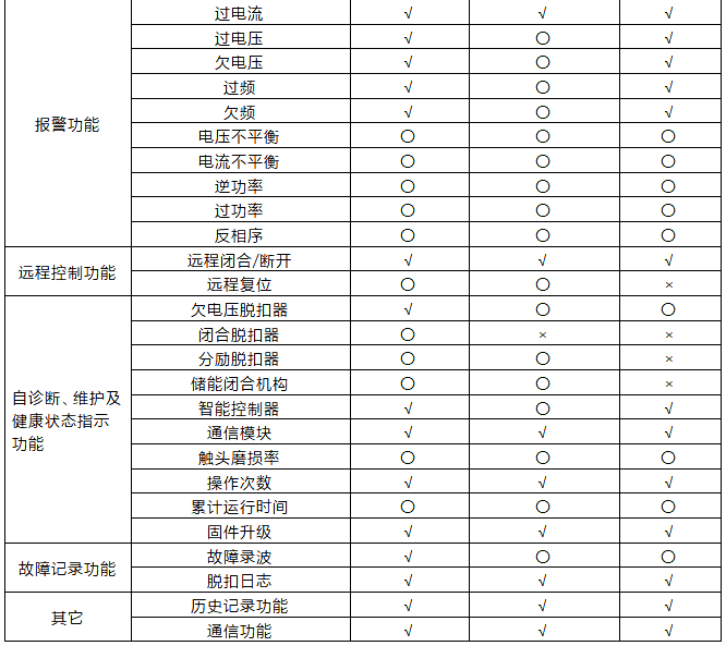 表中智能斷路器的“遠程復位”功能需謹慎!當過負荷或短路跳閘后不建議遠程復位,需人工現(xiàn)場排查故障后手動復位;萬能式斷路器的“電壓和電流不平衡”功能不需增加成本即可實現(xiàn),故作為基本功能。