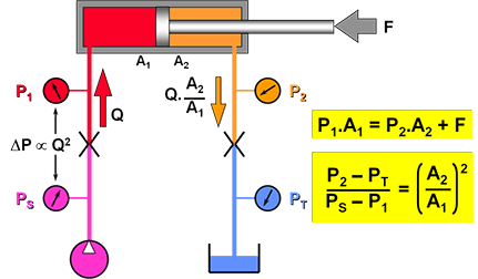 由于油缸面積比的不同,在保持力平衡的前提下于小腔而言相當于壓力放大器的作用;因而大腔的壓力變化,會在小腔得到一個放大和強化;而對于大腔而言又是一個流量放大器,對于下游容腔,流量的變化又會對應為壓力的變化;這同樣也會又傳遞到小腔進一步放大了這種變化。因而這會相對容易演變成壓力瞬變。
