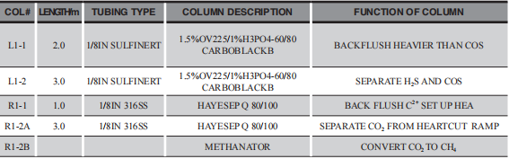 從表1和表2的配置圖中可以看出分離H2S和COS的色譜柱都經過鈍化處理(硅鋼管),分離CO2的色譜柱選的是316不銹鋼管,里面根據需要分離的組份放入不同的填充物(填料)。分離總硫的色譜柱中填充 1.5%OV225(高惰性交聯)和1.0%的磷酸,所以新鄉公司與新疆公司分離總硫的毛細管色譜柱長度一樣。分離CO2的色譜柱新鄉和新疆公司都是采用的安捷倫色譜柱,新鄉使用的固定相填充物為HAYESEP N型的新疆為HAYESEPQ型,所以長度不一樣,從長度來看新鄉項目的分離效果較好。