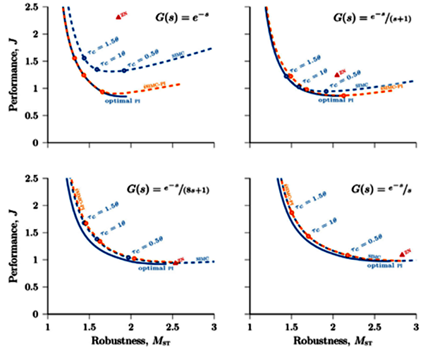 純滯后對象可以通過算法改進改善性能,但是純滯后對象實際應用中并不多所以對SIMC-PI進行改進意義不大。雖然使用微分能帶來性能和魯棒性的改進,但是增加微分會顯著增加整定的難度而且微分對噪聲非常敏感,這些改進是以增加輸入使用為代價的,以響應測量噪聲、輸出干擾和設定值變化。SIMC規(guī)則可能是最佳選擇。Skogestad教授針對更復雜的模型通過使用有效純滯后來近似其余的高階動態(tài)來處理。