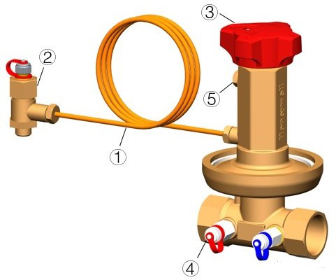 1、連接導壓管①,如安裝示意圖所示,一端接在VDPC動態壓差平衡閥上,另一端通過三通測量頭②接在靜態平衡閥上,此時系統應處于低壓狀態。