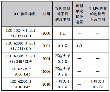 從2000年至2006年,IEC防雷標準對建筑物鋼筋電氣連續的電阻值有多輪討論,見表2。