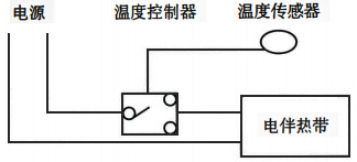 ②溫度控制電伴熱系統,可用于需要精確維持管壁溫度或加熱體內的介質溫度的場合,見圖。溫度控制電伴熱系統設置有顯示控制儀及溫度傳感器,在關鍵的電伴熱溫度控制回路中,宜設溫度超限報警和/或聯鎖。