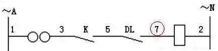 ③對(duì)調(diào)控制回路的電源極性,即相線換成零線,零線換成相線。按一般設(shè)計(jì)習(xí)慣,圖紙左邊的控制電源為相線,右邊為零線,而繼電器一般靠近右邊控制電源線布置,即一般繼電器的線圈直接接到零線,如下圖所示。按此接線,當(dāng)DL接點(diǎn)距離繼電器很遠(yuǎn)時(shí),電纜7感應(yīng)的電壓很高,就可影響繼電器的返回。對(duì)調(diào)相線和零線后,繼電器線圈兩端等電位,則可消除感應(yīng)電壓對(duì)繼電器返回的影響。