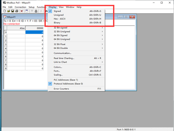點(diǎn)擊Display可以設(shè)置數(shù)據(jù)的顯示方式,默認(rèn)為Signed方式(16進(jìn)制無符號二進(jìn)制),數(shù)據(jù)范圍為-32768~32767。